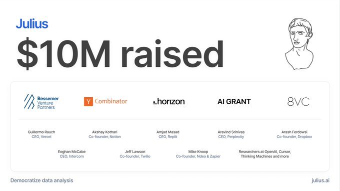 Julius AI ซึ่งเป็นบริษัทสตาร์ทอัพที่อธิบายตัวเองว่าเป็นนักวิเคราะห์ข้อมูลด้าน AI ได้ประกาศว่าได้ระดมทุน รอบ Seed Round มูลค่า 10 ล้านเหรียญสหรัฐฯ โดยมี Bessemer Venture Partners เป็นผู้นำในการไห้ทุนในคั้งนี้.