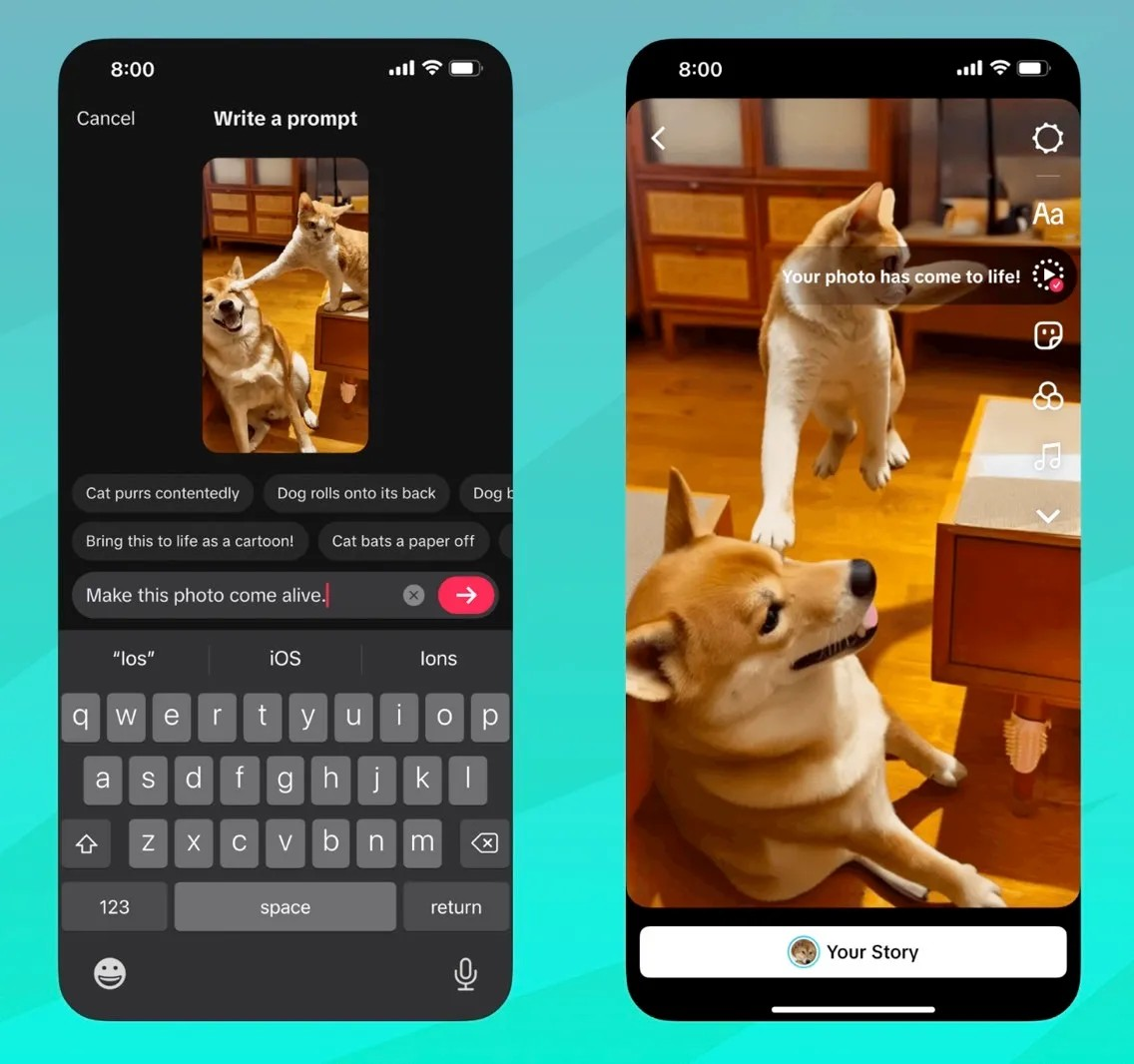 ไอคอน AI Alive ใหม่จะปรากฏทางด้านขวา ดังที่แสดงในภาพตัวอย่างของ TikTok แตะไอคอนเพื่อป้อนข้อความแจ้งเตือน ซึ่ง AI จะใช้เพื่อสร้างภาพเคลื่อนไหวให้กับรูปภาพของคุณ เมื่อคลิปเสร็จเรียบร้อยและคุณพอใจกับคลิปนั้นแล้ว คลิปนั้นจะแสดงให้ผู้ติดตามของคุณเห็นในฟีด “สำหรับคุณ” และ “กำลังติดตาม” นอกจากนี้ คลิปดังกล่าวยังจะปรากฏบนหน้าโปรไฟล์ของคุณด้วย.